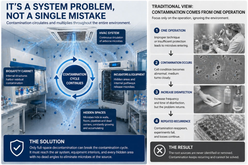 - Internal contamination within biosafety cabinets and incubators
