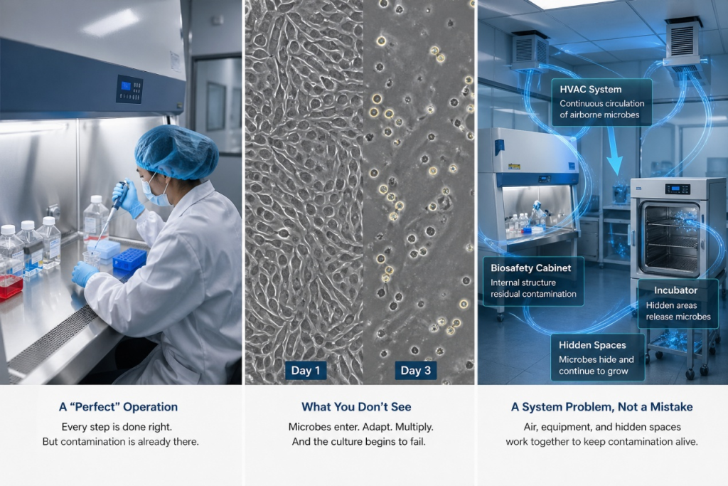 In a GMP cell preparation lab, an experienced technician was performing a routine media change. He followed every step precisely—gowning, hand disinfection, biosafety cabinet operation, fluid handling. Everything was controlled, stable, and by the book. There were no errors.